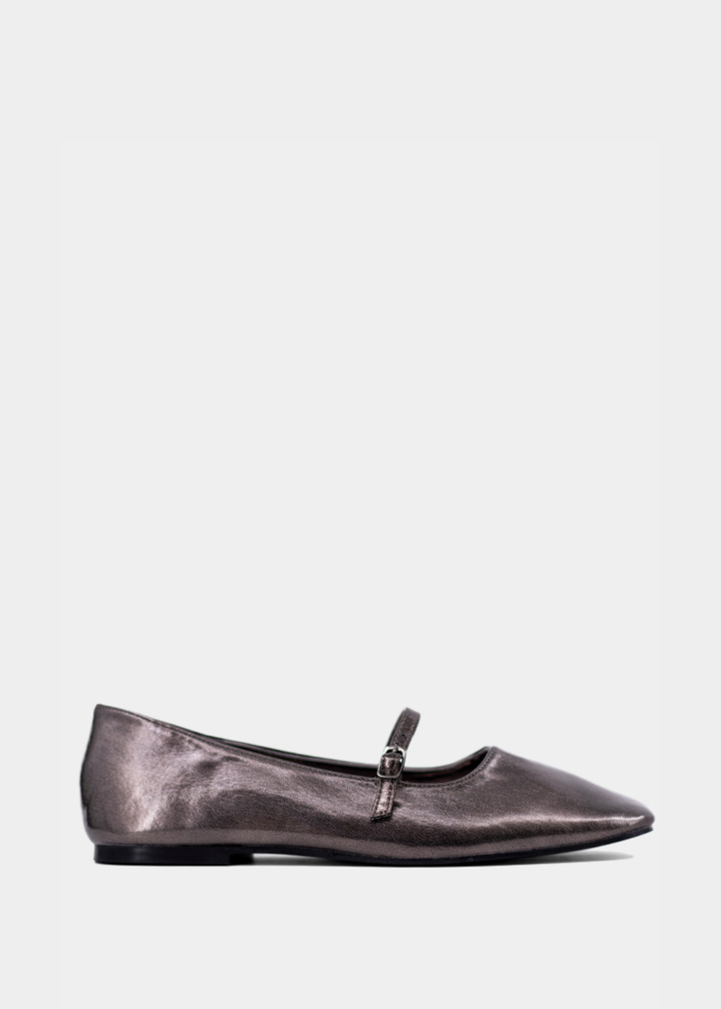Discover the unique blend of refined elegance and contemporary flair in the ADELE flat in Pewter. This pointed-toe Mary Jane flat elevates your style with its shimmering metallic faux leather finish. The charming buckle strap adds a playful twist, while the cushioned insole provides comfort for day-long wear. Ideal for casual rendezvous and elegant events, these ballet flats bring a chic sophistication to any outfit. Whether styled with tailored trousers, breezy dresses, or sleek skirts, they offer a versatile and timeless appeal that enhances your wardrobe.