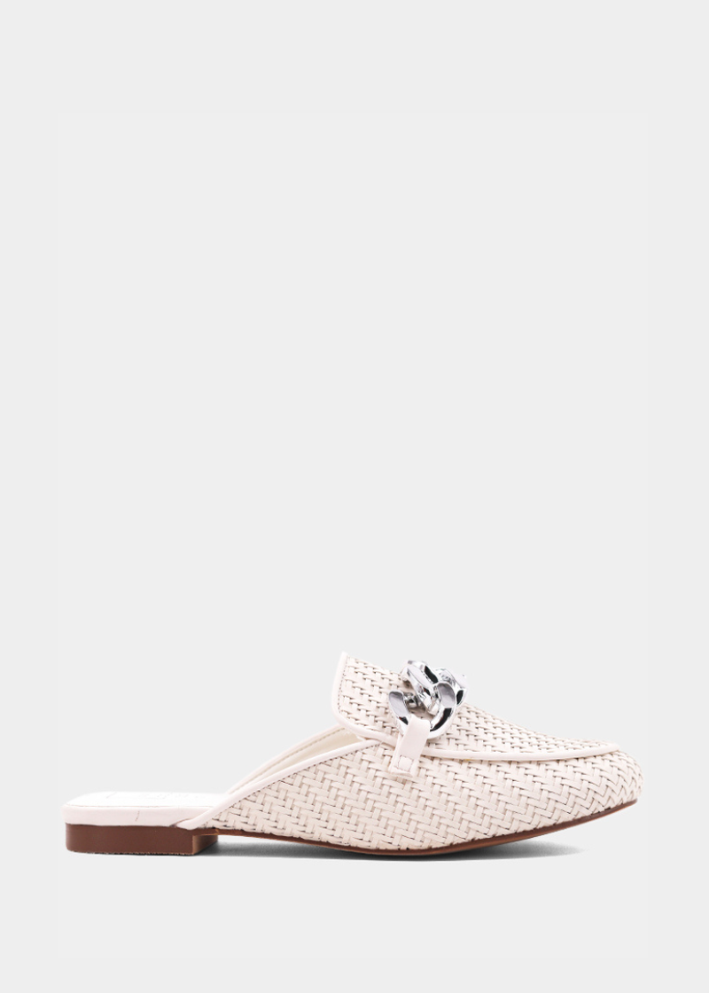 Elevate your style with the ALEXIS hybrid loafer-mule, now in crisp white. Crafted from intricately woven faux leather and adorned with a striking silver chain, this versatile piece adds a modern edge to any outfit. Whether for work meetings or weekend brunch, ALEXIS complements everything from tailored trousers to relaxed denim, making it the ultimate day-to-night essential.
