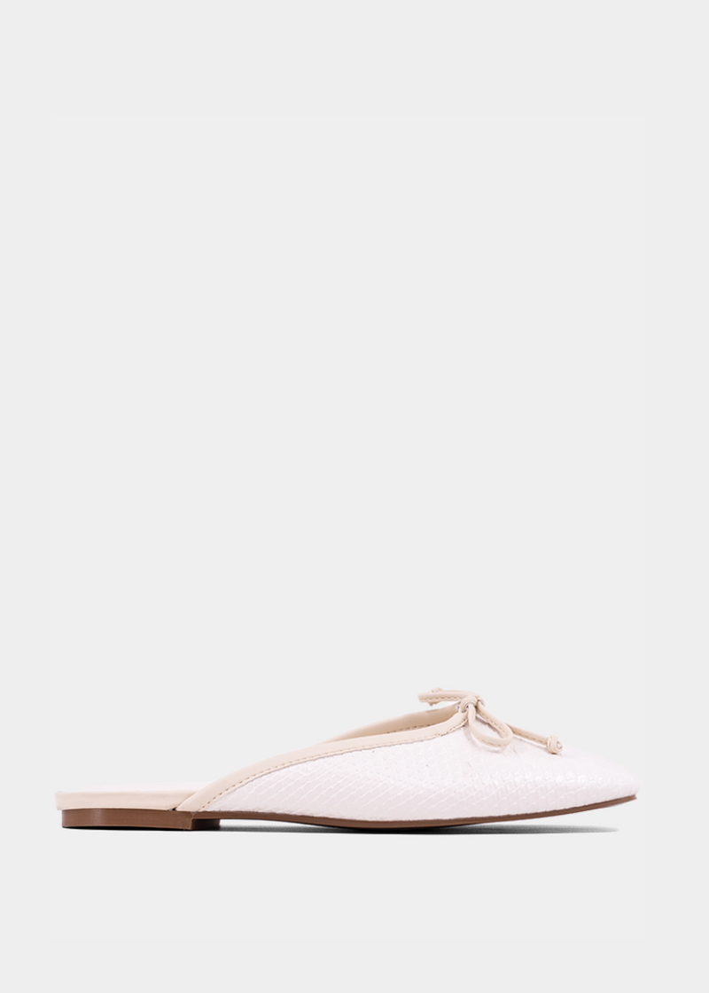 Effortlessly chic, the ANDREA in Bone Snake brings a refined edge to your everyday look. Crafted from sleek faux snake leather, this slip-on flat blends sophistication with ease. The delicate bow detail adds a feminine touch, while the pointed toe elongates your silhouette. Whether paired with tailored trousers or breezy dresses, it's a wardrobe essential with a polished finish.
