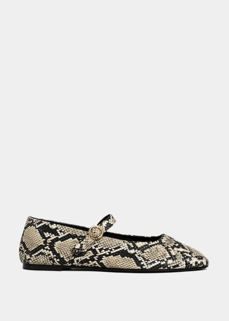 Striking and modern, the ANNABELLE flat in Snake brings texture and edge to your rotation. Its monochrome faux snakeskin adds a fashion-forward twist to this classic silhouette. The perfect flat for dressing up neutrals or grounding all-black looks.