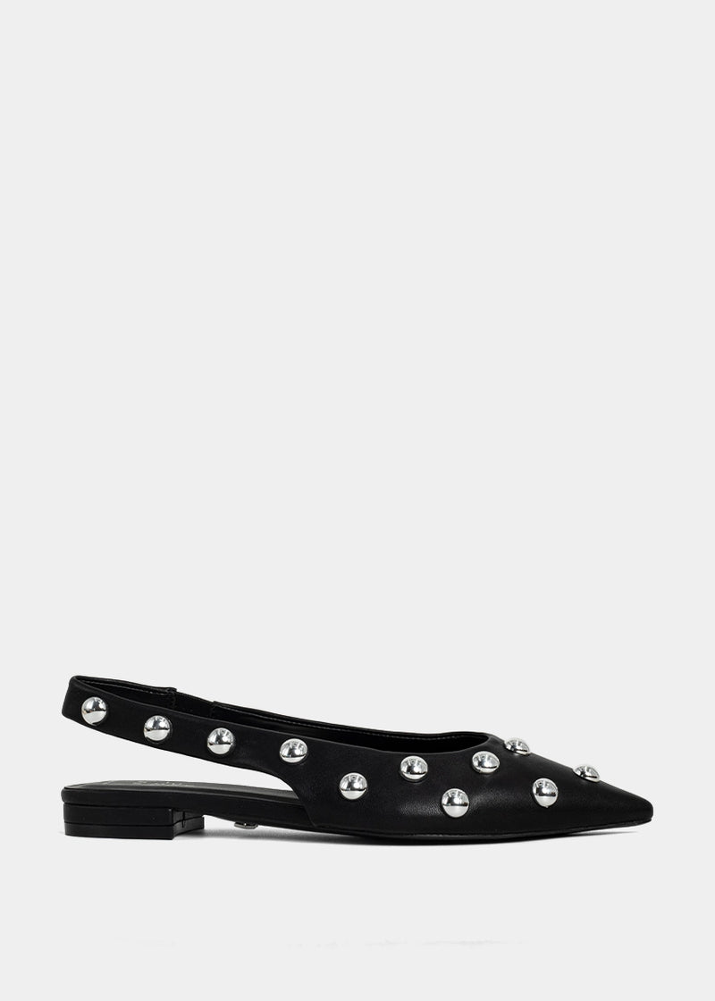 Sleek, sharp, and spiked with pearls. The ARIZONA flat in Black brings edgy elegance to your everyday style. Featuring a pointed toe, open slingback, and bold faux pearl embellishments, this statement flat turns up the volume on minimal silhouettes. Perfect with trousers, denim, or a dress, it's fashion with attitude, no heel required.