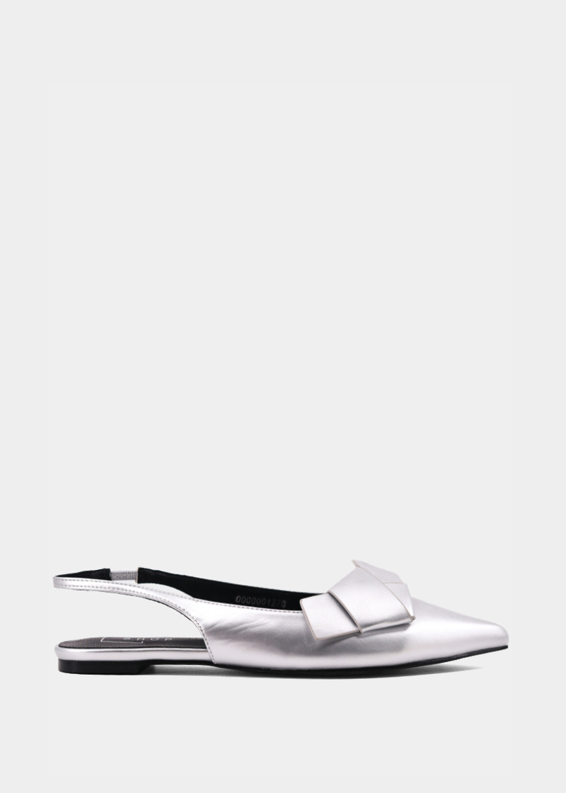 Introducing AUDREY in Silver, where sleek design meets a bold metallic finish. Crafted from high-quality faux leather with a pointed toe and standout bow, these slingback flats shine with a modern edge. The cushioned insole and flexible sole ensure all-day comfort, while the silver metallic touch adds a statement finish. Perfect for elevating both casual and dressy looks, AUDREY in Silver is your go-to for instant sophistication.