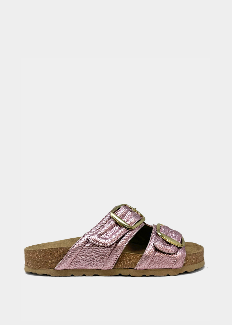 Shimmer, shine, and steal the show in the BARBARA sandal, straight from Italy's finest craftsmanship. Drenched in luxe metallic pink real leather, this bold yet feminine style is elevated with oversized gold-tone buckles for a high-fashion twist. The contoured footbed and cork sole make every step feel effortless because glamour should never be uncomfortable.