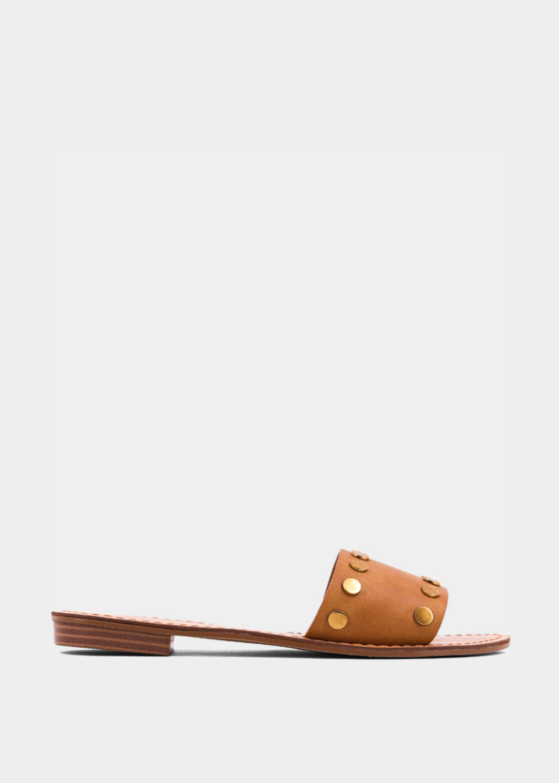 Classic with a hint of attitude, the BERNADETTE in Camel is a must-have for those who love warm, earthy tones. Made from supple faux leather, the rich caramel hue is complemented by gleaming gold studs, giving it a luxe, bohemian feel. Slip them on with linen pants or denim for a chic, effortless vibe.