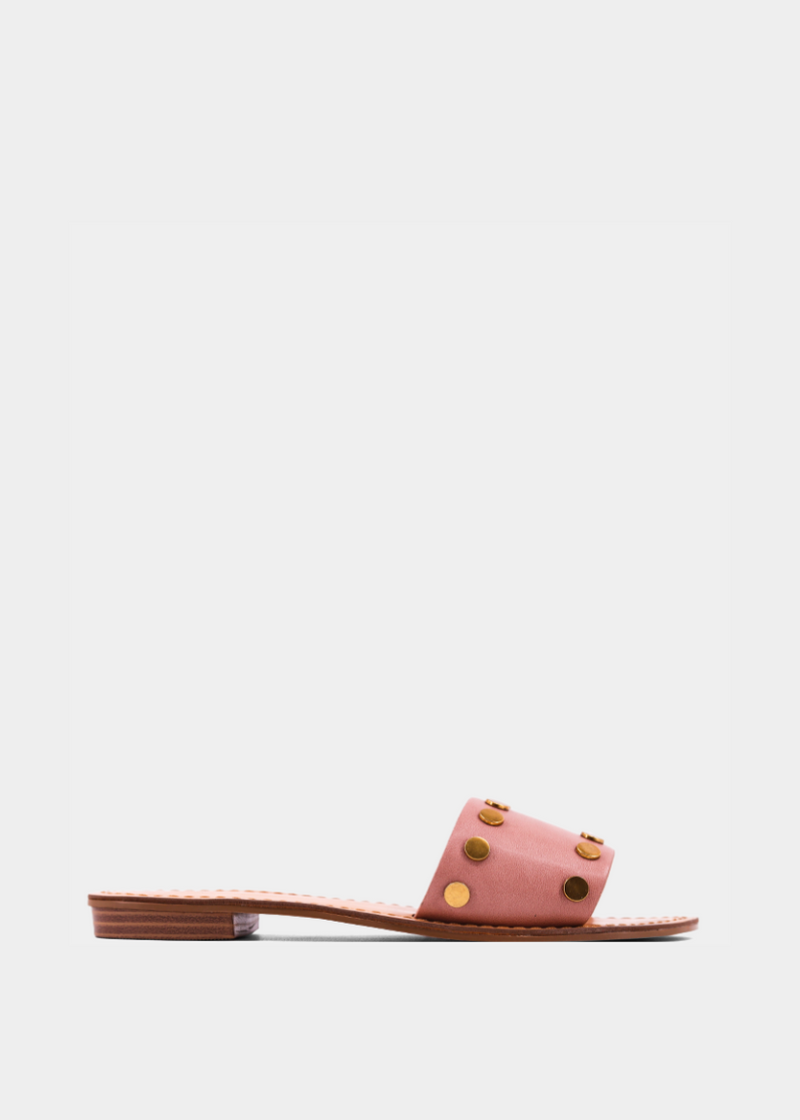 Soft yet striking, the BERNADETTE in Mauve is the feminine-meets-edgy sandal your closet needs. Crafted from buttery faux leather in a dusty rose hue, this slide is finished with bold gold studs for a perfect balance of romance and attitude. Pair it with flowy skirts or structured trousers for an effortlessly chic look.