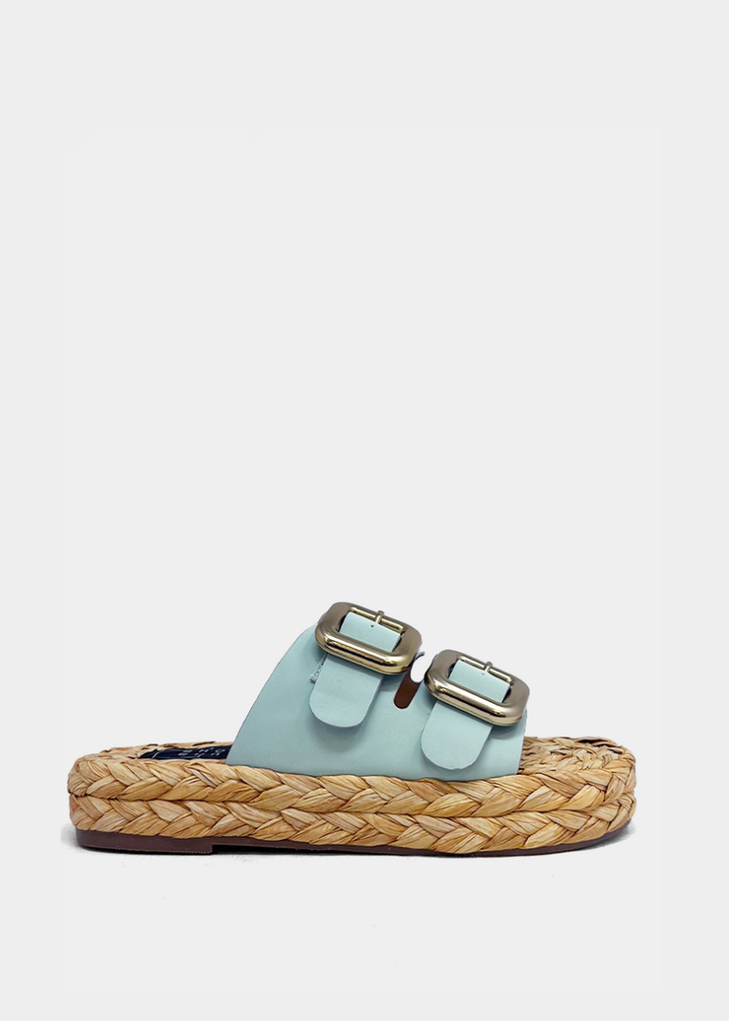 Step into summer with the BILLIE in Mint, a fresh take on the classic double-strap sandal. Crafted from smooth faux leather, its sleek design is elevated by oversized gold-tone buckles for a luxe touch. The woven jute sole adds a natural, breezy vibe, while its subtle wedge effect gives just the right amount of lift. Comfortable, stylish, and effortlessly chic this is the go-to sandal for laid-back glam!