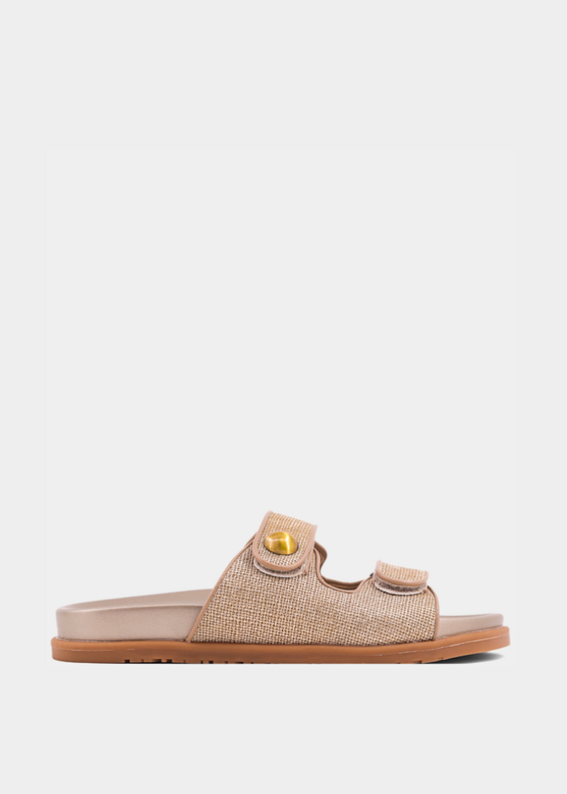 The BLAIR sandal brings laid-back luxury to your everyday style. Designed with a textured woven faux upper in a soft gold tone, adjustable oversized buckles, and a lightweight rubber sole for extra comfort. The easy slip-on silhouette and padded footbed make them your go-to for spring and summer days. Shine from brunch to beach with effortless ease.