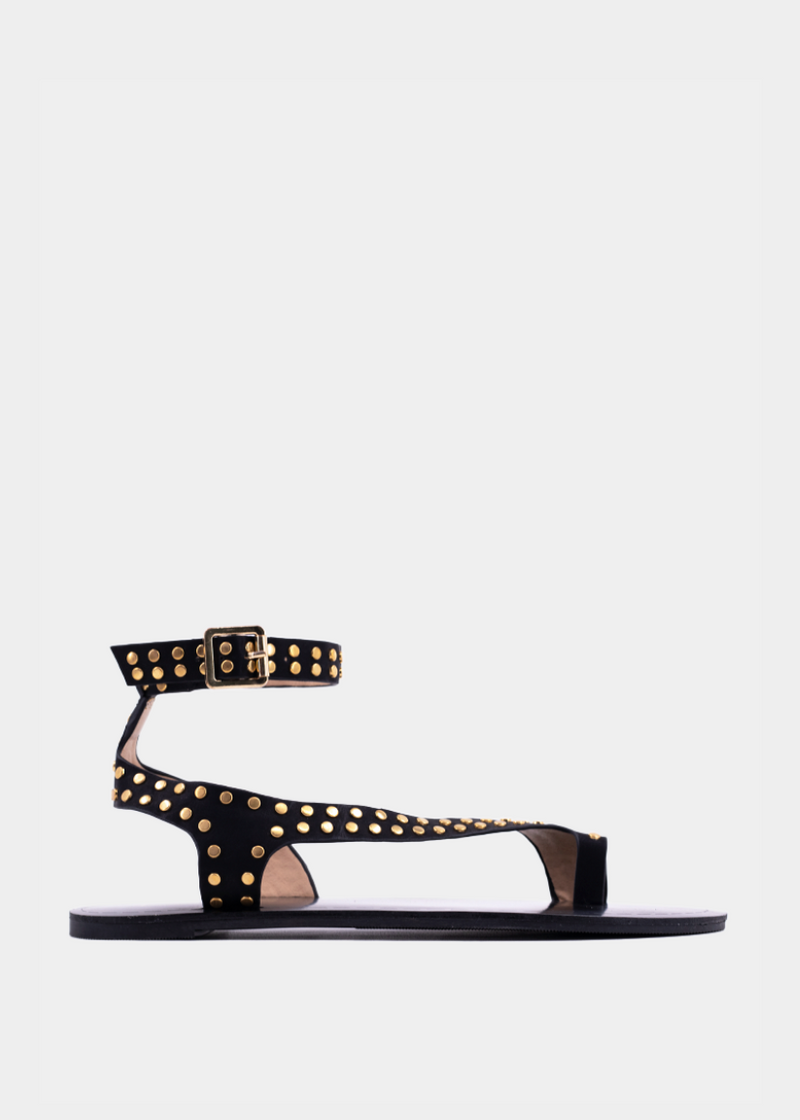 Sharp, sleek, and a little daringthe CARRIE in Black is the definition of modern cool. Designed with smooth faux leather and gleaming gold-tone accents, this sandal delivers a refined yet striking aesthetic. The minimalist structure is balanced by bold stud detailing, while the secure ankle strap and toe loop add both function and flair. Whether paired with an all-black ensemble or a flowing dress, it's an instant outfit upgrade.