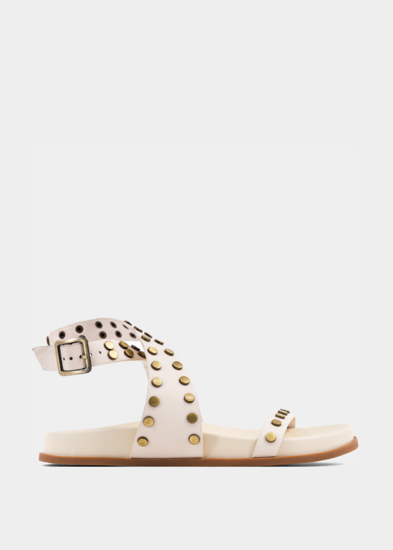 Edgy meets effortless in the CECILY sandal. Crafted from smooth bone faux leather, its bold studded straps and oversized buckle make a statement. The cushioned footbed and flat sole ensure all-day comfort, making it the perfect mix of fierce and functional.