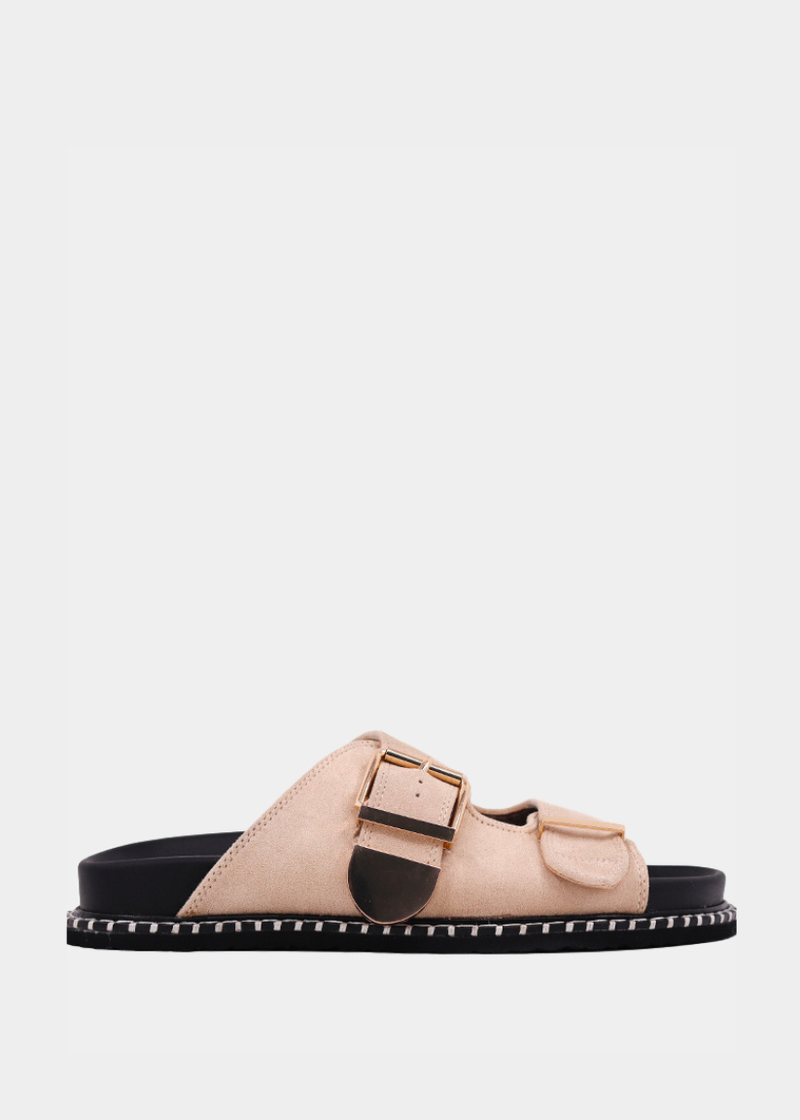 Meet the CHARLOTTE sandal in luxurious beige suede, featuring dual wide straps with gold-tone buckles and crest embellishments for a touch of sophistication. A contrast-stitched sole adds flair, while a cushioned footbed ensures all-day comfort. Effortlessly chic, the CHARLOTTE is perfect for elevating any outfit.