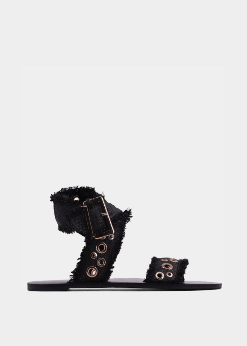 Edgy yet sophisticated, the CINDY in black woven raffia is a statement piece with a daring touch. The frayed texture gives it an effortlessly cool vibe, while silver-tone grommets add a modern twist. Designed with an adjustable ankle strap and a sleek black sole, this sandal is perfect for taking your summer looks to the next level. Whether styled with monochrome outfits or a pop of color, this pair guarantees major style points.