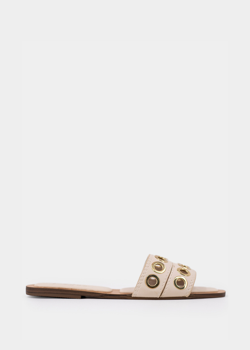 Elevate your spring wardrobe with the CODIE flat sandal in Bone. Designed with smooth faux-leather and accented by striking oversized gold eyelets, this sandal perfectly balances understated tones with bold details. Featuring a padded insole for all-day comfort, CODIE is the ideal choice for both casual and chic looks. Style it with flowy dresses or tailored pieces for effortless sophistication.