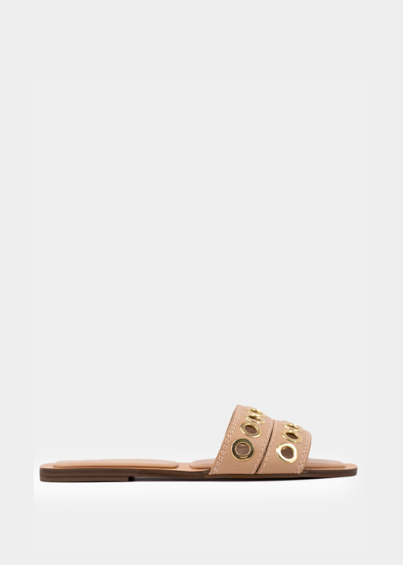 The CODIE flat sandal in Nude is your go-to for versatile, chic style. Crafted with smooth faux-leather in a soft nude tone and highlighted by bold oversized gold eyelets, this sandal adds just the right amount of edge to any outfit. The padded insole offers all-day comfort, making it perfect for everything from brunch dates to evening strolls. Pair CODIE with your favorite spring looks for a polished finish.