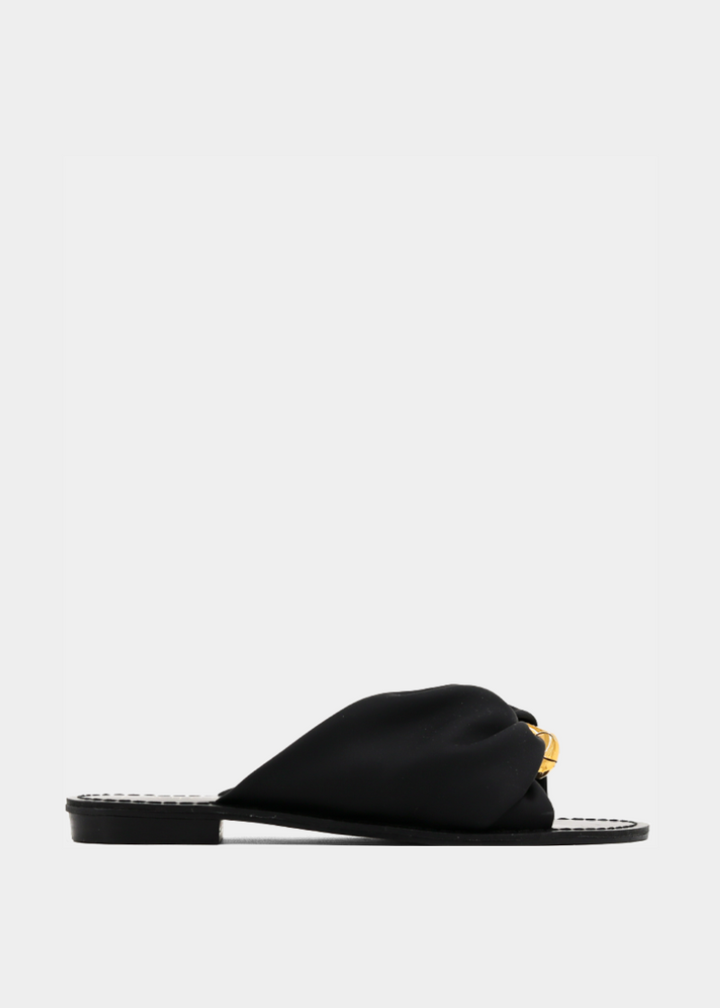 Timeless with a bold edge. The DAWN sandal in Black redefines minimalism with its knotted draped upper in sleek faux leather. Set on a structured footbed with a contrasting black insole, this slide blends effortless sophistication with wear-anywhere appeal. A must-have for every fashion-forward wardrobe.