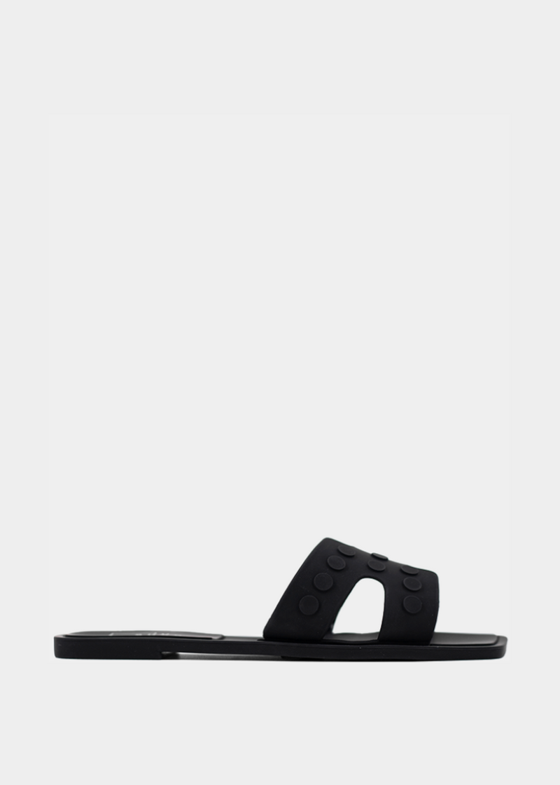 Sleek, minimal, and effortlessly cool the DONNA slide in Black is a modern essential. Made from soft, flexible rubber, its sculptural cutouts and raised stud accents add a contemporary edge while keeping things ultra-comfortable. Whether you're at the beach or styling it with streetwear, this jelly-inspired sandal is a must-have