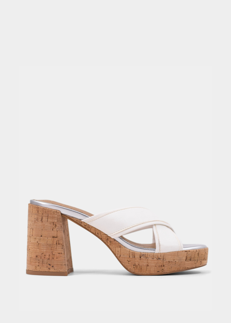 The ELEANOR heel sandal in White is a fresh take on timeless style. Featuring a crisp white faux-leather crisscross upper, a natural cork block heel, and a sleek metallic silver insole, this sandal is designed to stand out. The cushioned footbed ensures all-day comfort, making it ideal for everything from sunny brunches to evening getaways. Effortlessly chic, ELEANOR is your must-have for the season.