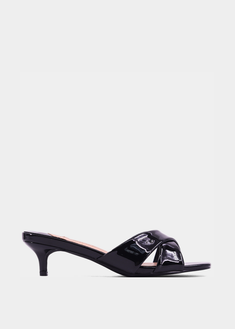 The EMMA sandal in Black Patent delivers timeless polish in a wearable mid-heel silhouette. Featuring shiny black crisscross straps and a pointed toe, this versatile pair transitions effortlessly from desk to dinner.