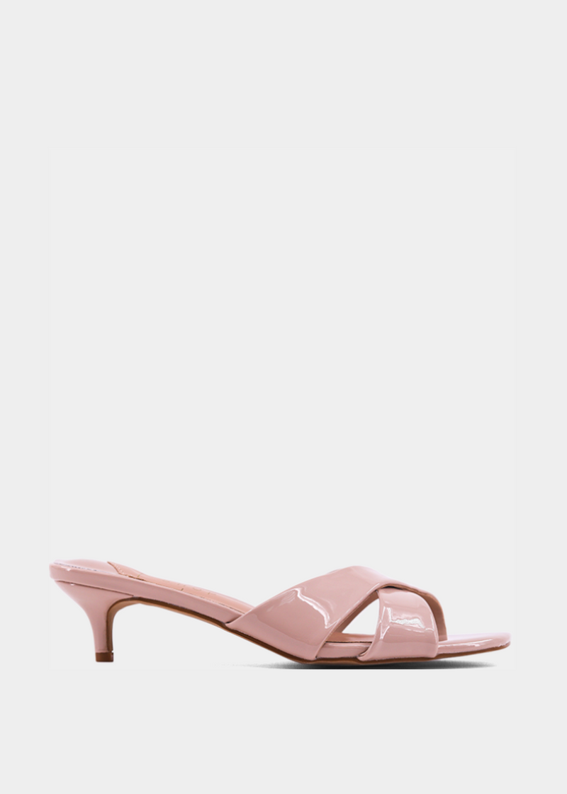 A minimal mule with maximum style. The EMMA sandal in nude patent is a sleek, mid-heel slide designed with crossover straps and a pointed toe. Its glossy faux leather finish makes it perfect for day or night looks, from jeans to dresses