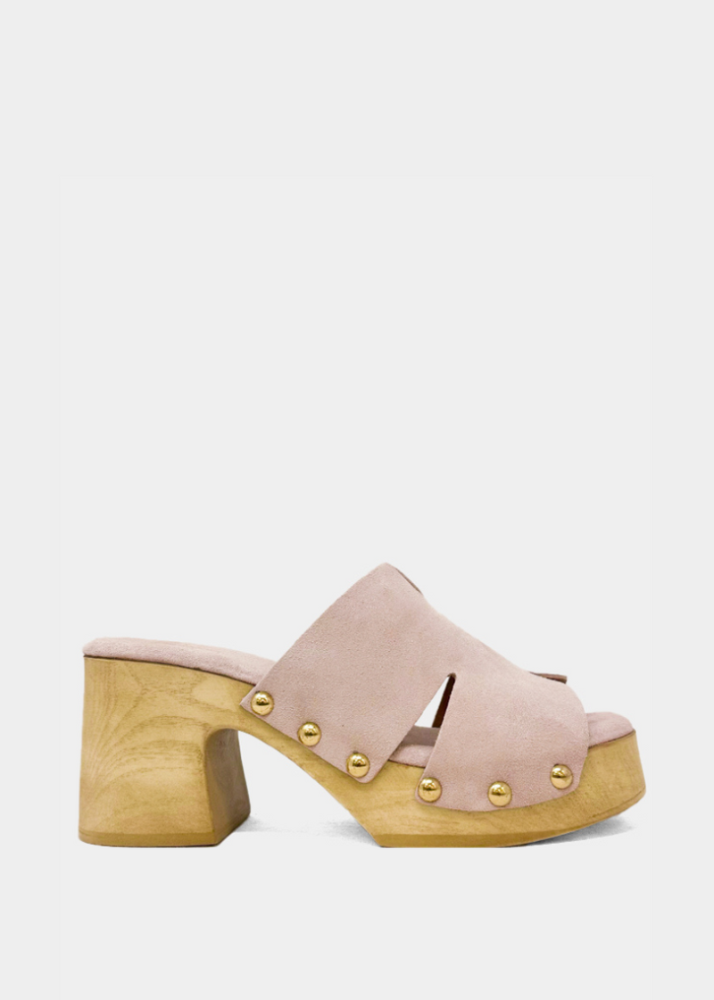 The FLORENCE clog sandal in soft blush suede embodies effortless elegance. Featuring a natural wooden platform and chunky heel, this Italian-made staple blends comfort with style. Its intricate cutout design and gold-tone stud accents add to its vintage charm, making it versatile for feminine, bohemian, or minimalist looks.