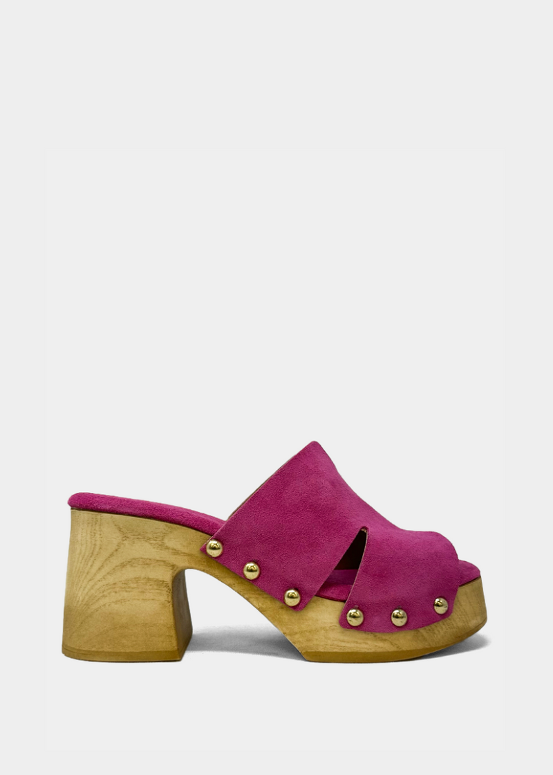 Make a bold entrance with the FLORENCE clog sandal in vibrant fuchsia suede. Designed for those who love a pop of color, this Italian-crafted beauty boasts a sculpted wooden sole, gold-tone studs, and a retro-inspired silhouette. The geometric cutouts add an edgy flair, while the cushioned footbed ensures all-day wearability. Pair it with neutral tones or mix and match for a playful, fashion-forward look.