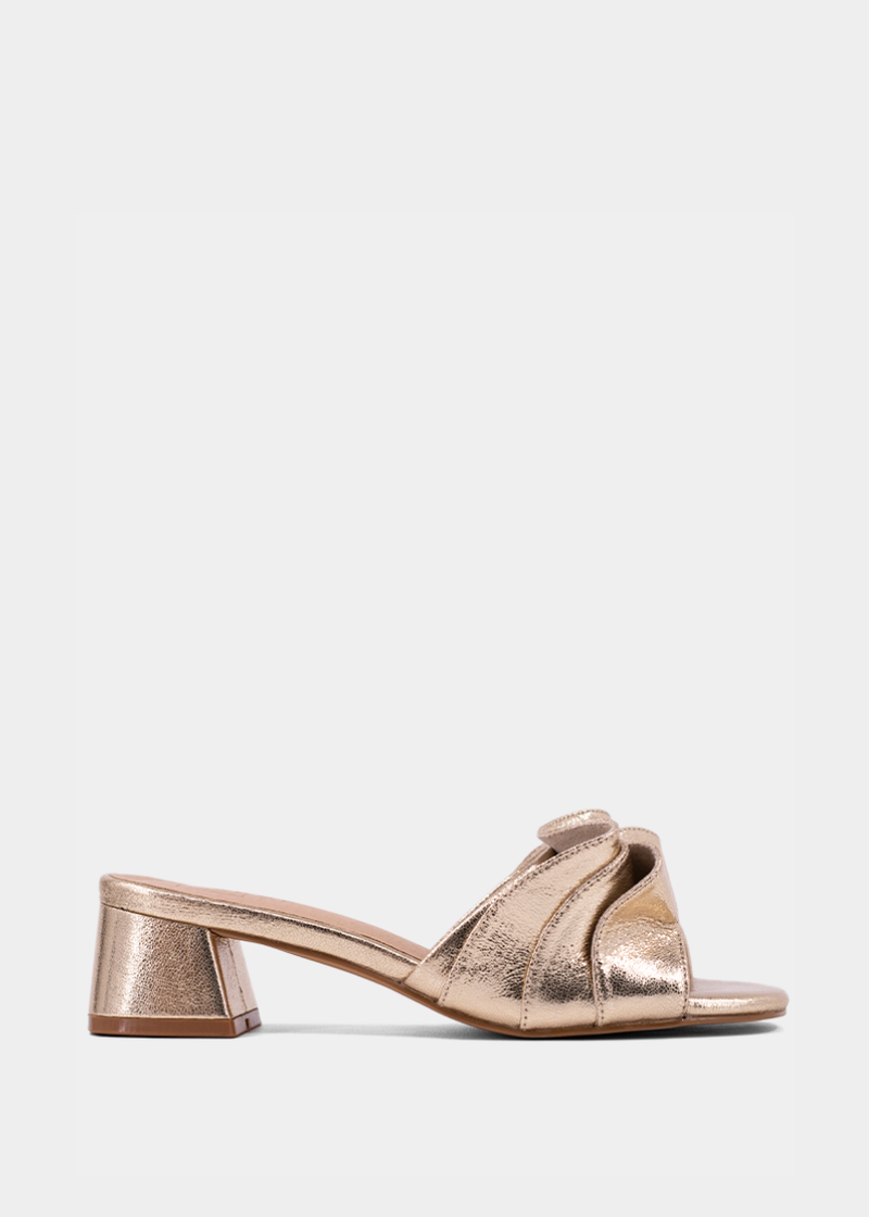 Fashion meets comfort with FRANCES. Crafted from textured fabric and featuring a chic rushed upper, these gold block-heel mules with a rushy finish elevate any look. Perfect for all-day wear with a sturdy low heel, they're your go-to for effortless style.
