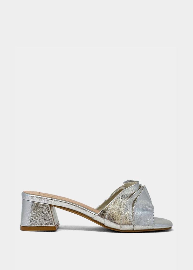 Elevate your style with FRANCES. These silver block-heel mules feature a chic rushed design and a rushy textured finish, blending comfort with a touch of glamour. Perfect for all-day wear, their sturdy low heel makes them the ideal choice for effortless, chic styling.