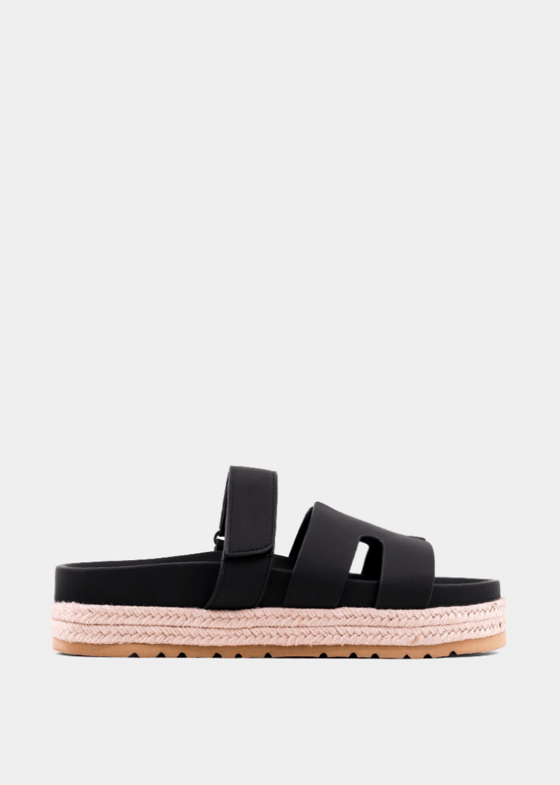 The IZZY in black is your go-to for effortless chic. Crafted from smooth faux leather, its wide straps and adjustable velcro closure ensure a secure fit, while the braided jute platform adds a touch of summer-ready texture. Pair them with anything from flowy dresses to relaxed denim for an elevated everyday look.