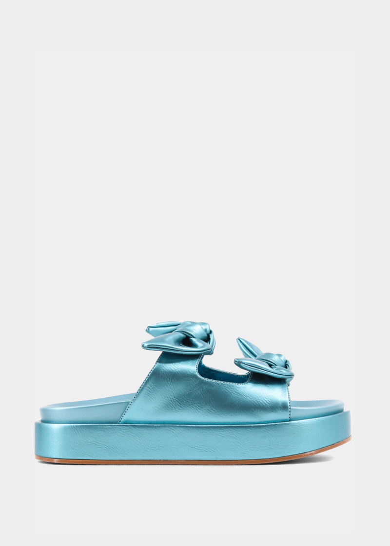 Step up your style with these sleek wedge sandals, crafted from high-quality faux leather in a stunning aqua hue with a metallic finish. Crowned with two dainty bows, the cushioned platform ensures all-day comfort, making them the perfect blend of chic and comfort for any season.
