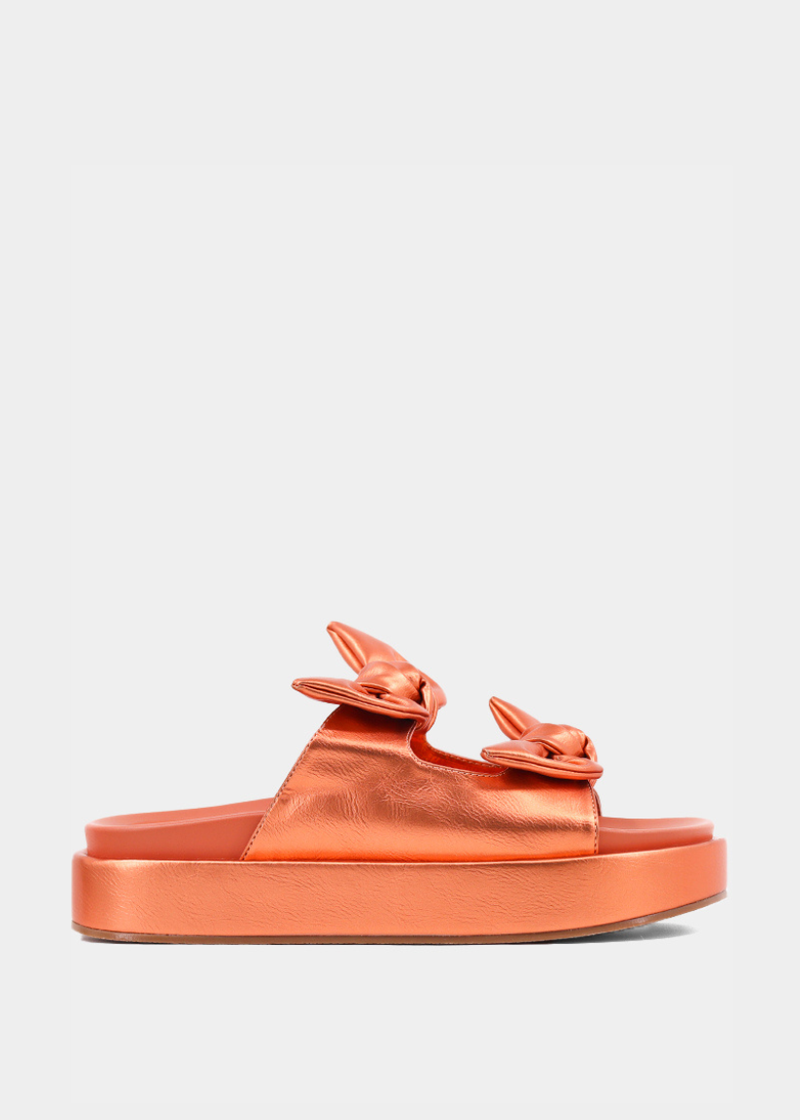 Step up your style with our KIKI wedge sandals, crafted from high-quality faux leather in a vibrant melon hue with a metallic finish. Crowned with two dainty bows, the cushioned platform ensures all-day comfort, making them the perfect blend of chic and comfort for any season