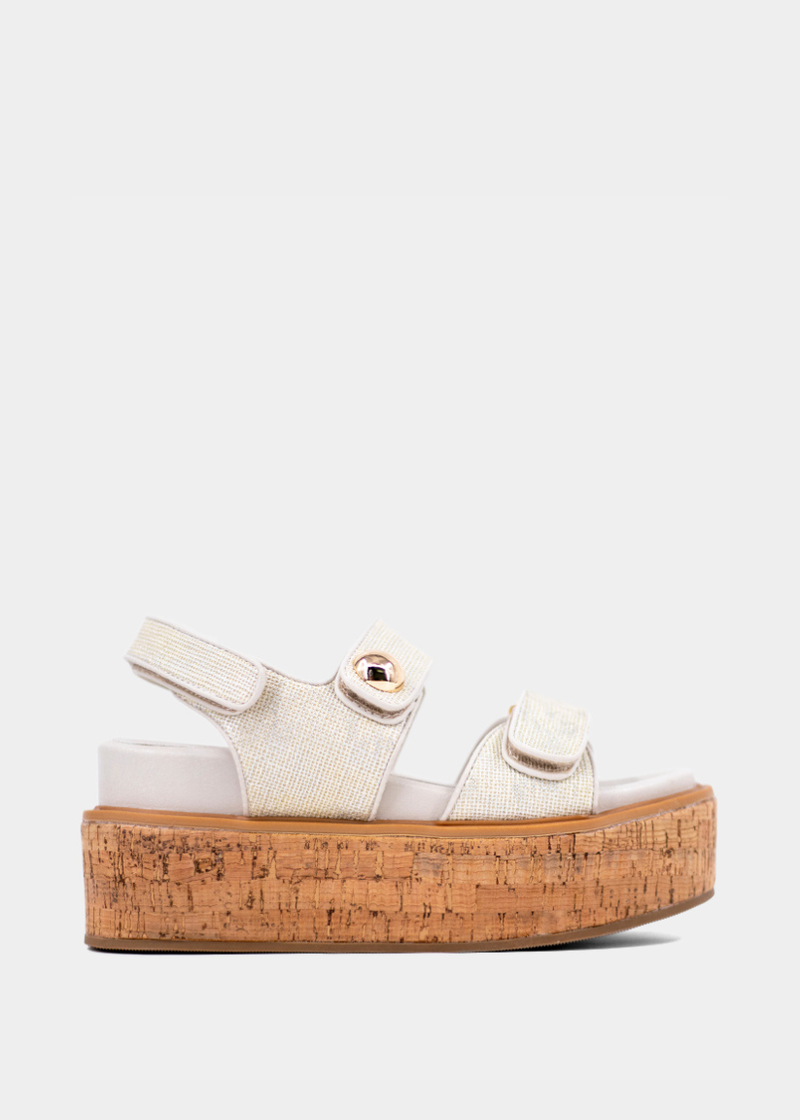 .Discover understated elegance with the LUCILLE wedges in Silver Woven. The subtle metallic fabric offers a sophisticated, modern look, while the natural cork platform ensures lightweight comfort. With adjustable velcro straps for a customized fit, these wedges, finished with a hint of silver sparkle, are ideal for elevating both casual daywear and polished evening outfits.