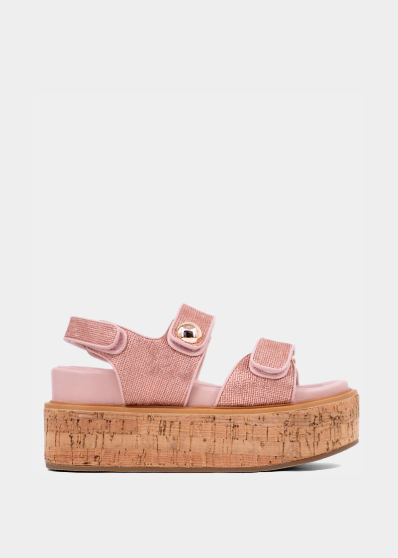 The LUCILLE wedges blend modern materials with timeless style, making them a wardrobe essential. Made from chic Blush Woven fabric, these sandals offer comfort with a lightweight cork platform and padded footbed. Adjustable Velcro straps provide a secure fit, accented by elegant gold-tone details. Perfect for pairing with flowy dresses or casual denim, these wedges elevate any look.
