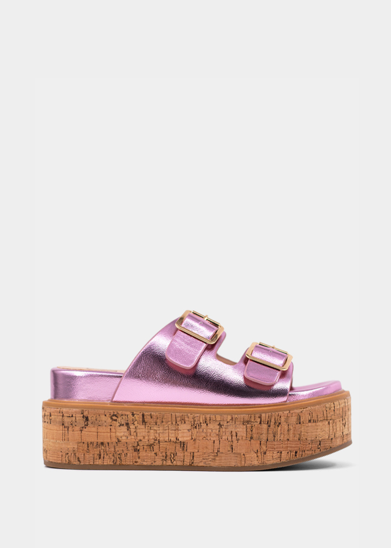 Our new addition, LUCINDA, features buckles that add a gleaming signature to the dual-strap upper of this dreamy metallic pink faux buttery leather slide sandal. It floats on a cushy memory foam footbed and a timeless cork-wrapped wedge platform. Wear yours with breezy summer dresses or slouchy jeans.