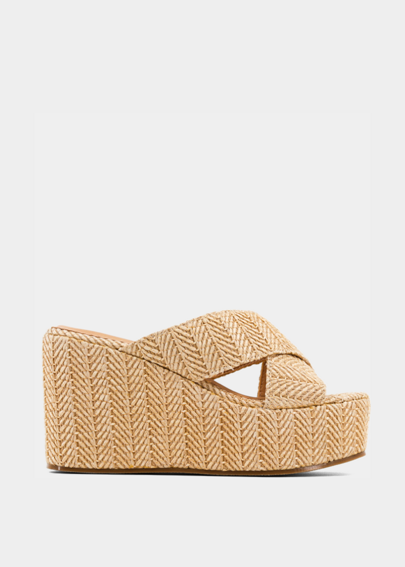 Elevate your summer wardrobe with LUDOVICA in natural woven raffia. Designed for maximum impact, this platform wedge features a soft, neutral-toned woven upper that exudes bohemian elegance. The wide crossover straps offer a secure fit, while the soaring sole gives you the height you crave without compromising comfort. Pair it with flowy dresses or linen sets for a sun-kissed, effortlessly polished look.