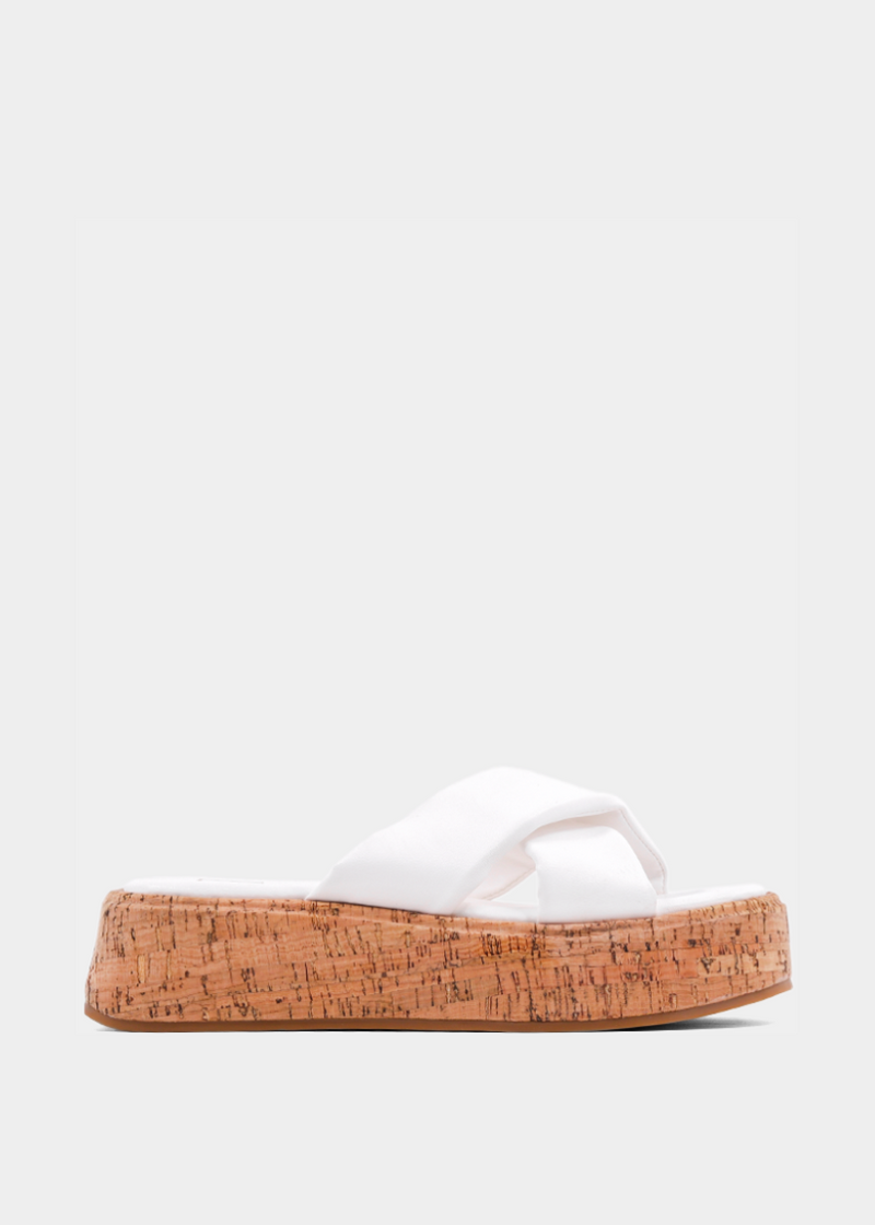 Fresh, clean, and stylish, the LYDIA in white is your go-to summer sandal wedge. The smooth faux leather straps contrast beautifully with the cork platform sole, giving you an effortlessly elevated look. Perfect for pairing with breezy linen outfits or your favorite denim.