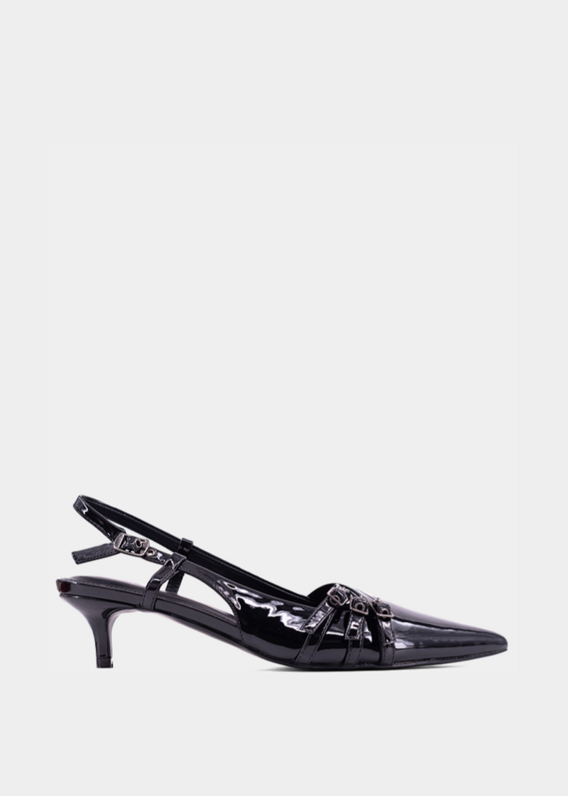 Timeless yet daring, the NADJA slingback in black faux patent leather is the epitome of sleek sophistication. Its high-shine finish gives off a polished edge, complemented by delicate buckle-detailed straps for a touch of attitude. The pointed toe elongates the foot, while the low kitten heel keeps it effortlessly wearable. Finished with an adjustable slingback strap, this style transitions seamlessly from desk to dinner, elevating every outfit with refined allure.
