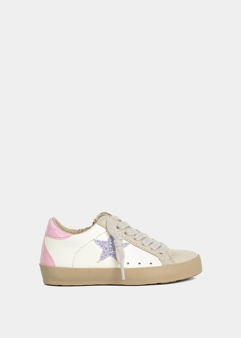 Classic meets playful in the PAULA MINI sneaker in Lilac Glitter. Designed for little trendsetters, this style combines a clean white base with a sparkly purple star and soft pink heel accent. Faux suede details give it a sporty-cool edge, while the comfy shape makes it perfect for school days, weekend adventures, and everything in between.
