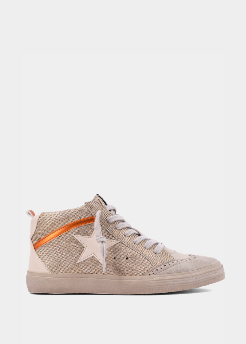 The PAULINA is a stylish mid-top sneaker. This pair features a golden woven upper with faux leather and suede accents. It showcases a creamy star detail and a metallic golden-orange stripe. With a round toe, cushioned insole, and durable sole, it combines standout style with all-day comfort ideal for elevating casual outfits.