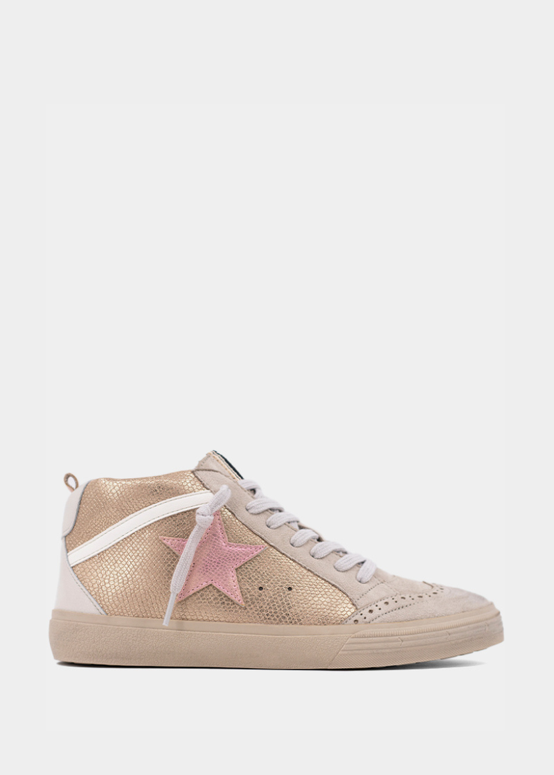 PAULINA dazzles in Champagne Snake with a faux-snakeskin upper that glimmers in soft champagne tones, radiating effortless elegance. Beige suede overlays add a grounding touch of warmth, while creamy faux-leather accents on the ankle and side stripe keep it sleek. The star pops in a muted blush pink faux-leather, adding a playful yet sophisticated contrast. A sturdy rubber sole ensures comfort and durability, making this statement pair your go-to for everyday glam