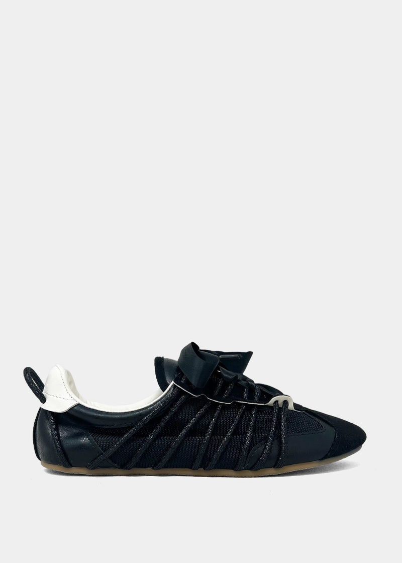 The ballet trend gets a sporty remix with SHERYL in Black. This low-profile sneaker fuses sleek mesh and faux leather with ribbon-style laces for a feminine edge. The contrast heel tab and soft neutral lining add that subtle twist, making this pair just as perfect for jeans as it is for flowy skirts.
