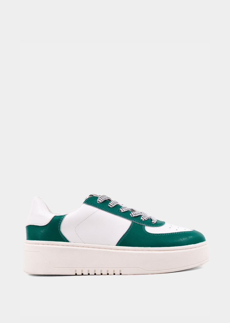 Elevate your style with our platform sneaker, SHIRLEY. Featuring a durable platform for support, this retro-inspired sneaker is crafted from ultra-soft metallic green and white faux leather. Perfectly versatile, it pairs beautifully with skirts or tailored trousers, making it an essential addition to your wardrobe.