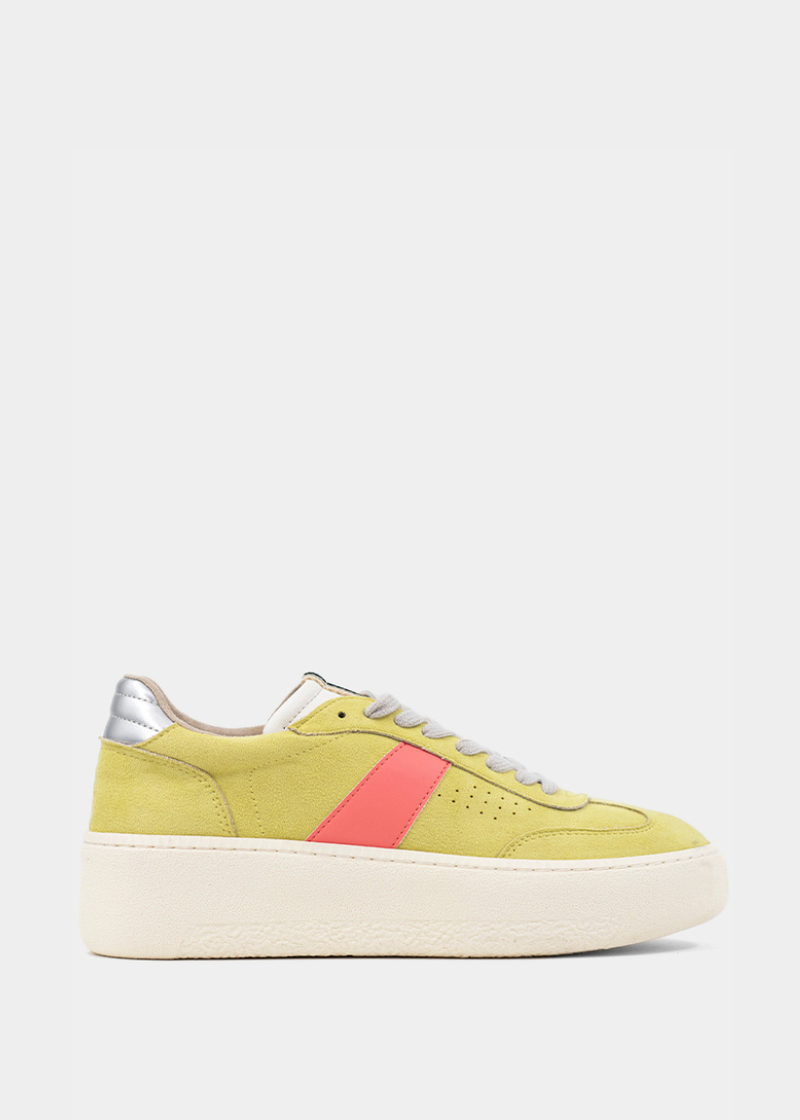 The STACEY in Lime Suede is a statement sneaker that blends vibrant color with modern functionality. Crafted from soft lime suede and accented with a bold coral faux-leather stripe, this sneaker stands out effortlessly. The chunky textured platform sole offers height and comfort, while the metallic silver heel adds a sleek touch. Finished with the signature "S" metallic tag and detachable rubber charm, this playful detail adds a unique and customizable flair. Perfect for turning heads, STACEY is the ultimate combination of bold design and everyday wearability.