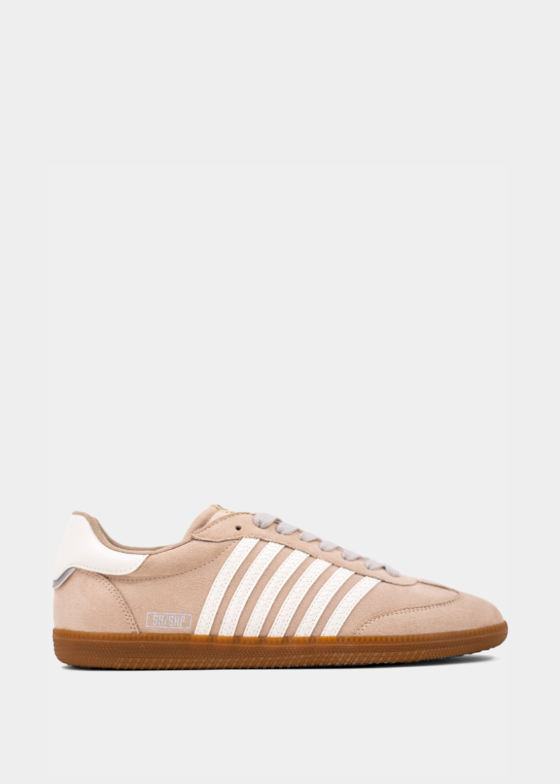 Step up your game with STEVIE in Beige Suede! This retro-inspired sneaker redefines cool, featuring crisp white stripes and a matching heel accent. Crafted with luxe suede body and faux leather accents and finished with a gum sole, it's the perfect mix of style and comfort. Ready to own the spotlight?