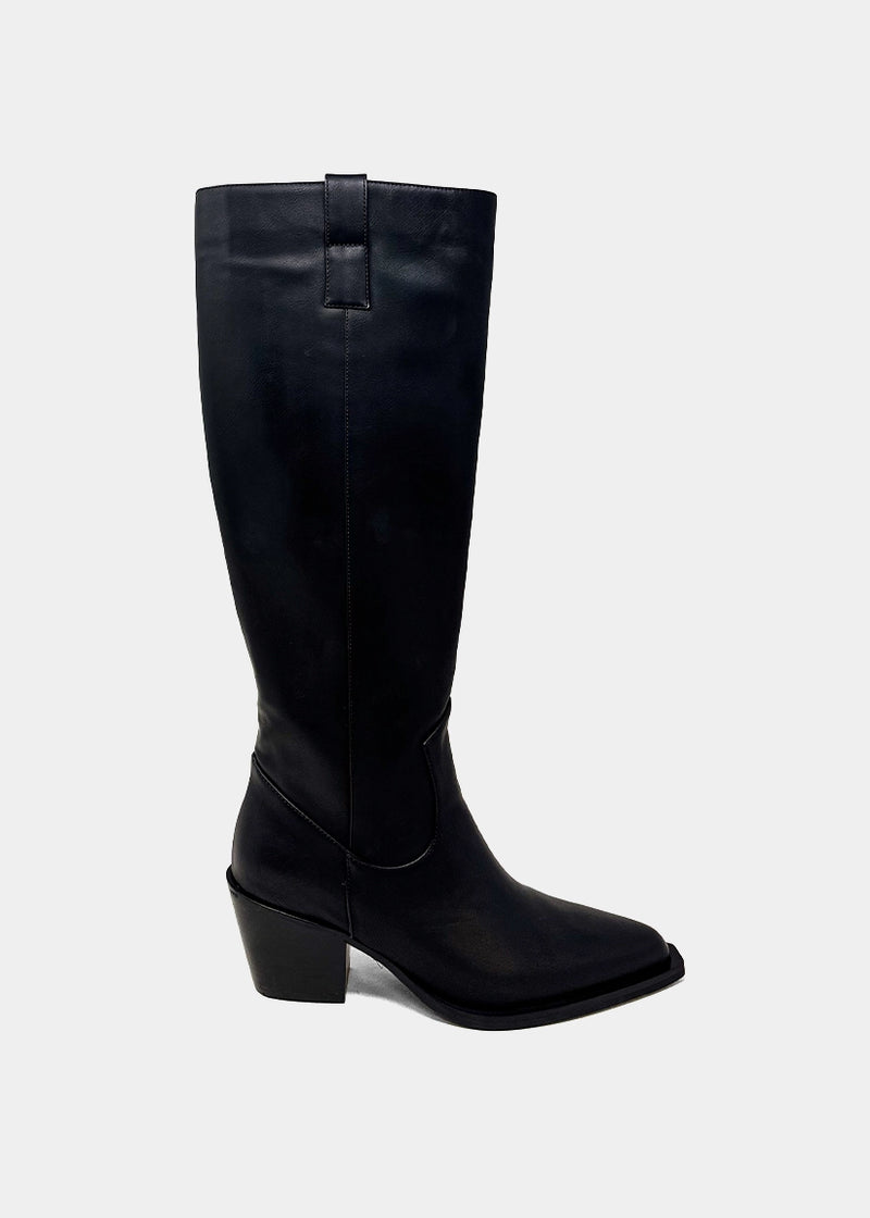 The tall boot your wardrobe’s been waiting for. VIENNA in Black brings sleek Western energy to your cold-weather style, with a knee-high shaft, sculpted mid-heel, and modern square toe. Crafted in smooth faux leather, it’s the kind of statement boot that makes every outfit feel intentional-from oversized knits to tailored coats.