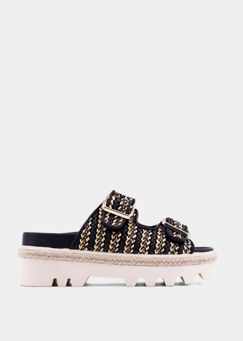 Upgrade your warm-weather look with XYLA, a bold flatform sandal that merges comfort and edge. The woven-textured upper in black and gold adds a luxe feel, while adjustable pin-buckle straps ensure the perfect fit. Featuring a lightweight elastic outsole, molded footbed, and rope-detailed trim, this standout style delivers both height and ease. Pair it with anything from breezy dresses to denim for an effortlessly chic finish!